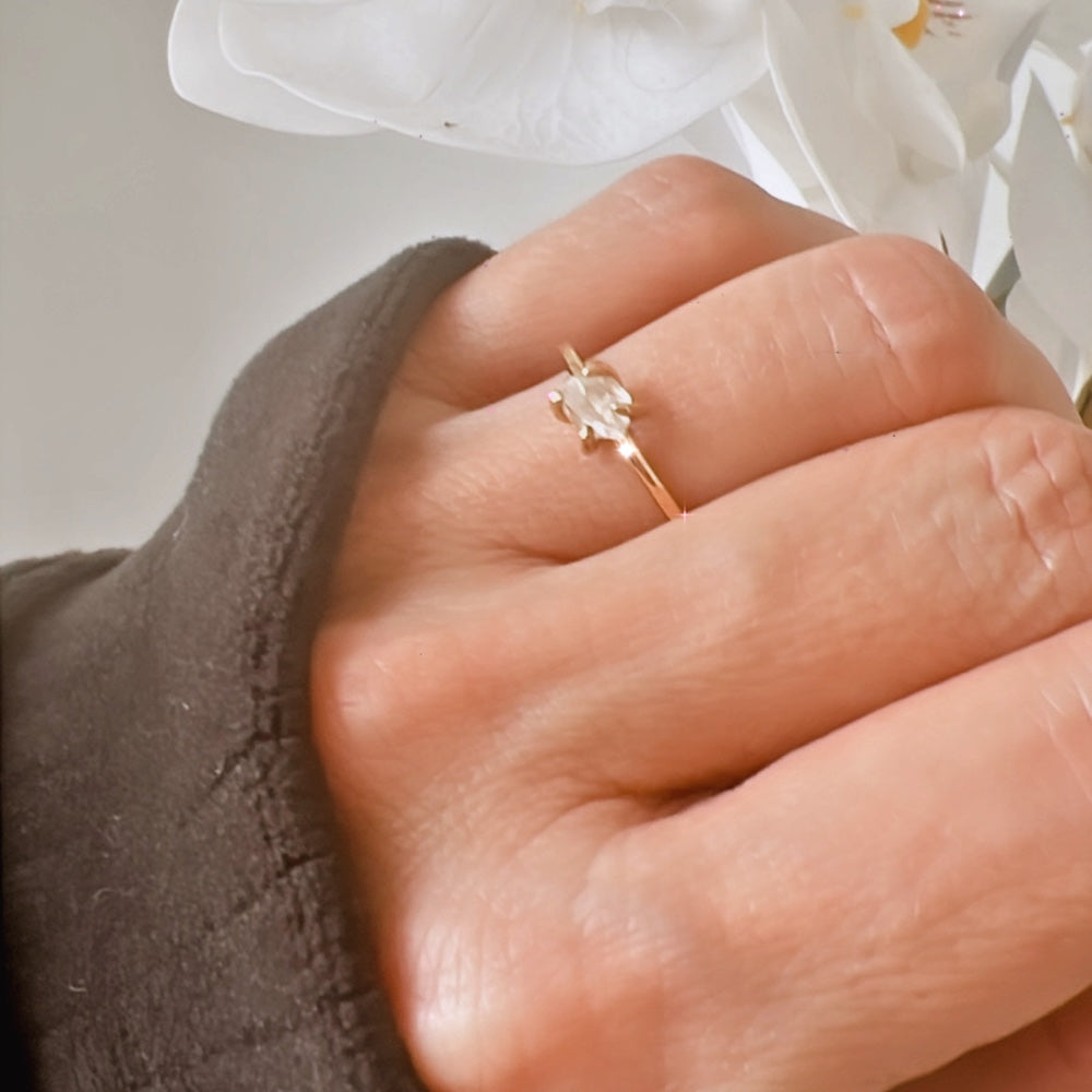 The design includes prongs that secure the Herkimer Diamond in place, highlighting its natural beauty while adding a subtle, yet stylish element to the ring. This dainty piece is perfect for everyday wear, adding a touch of sophistication to any outfit.