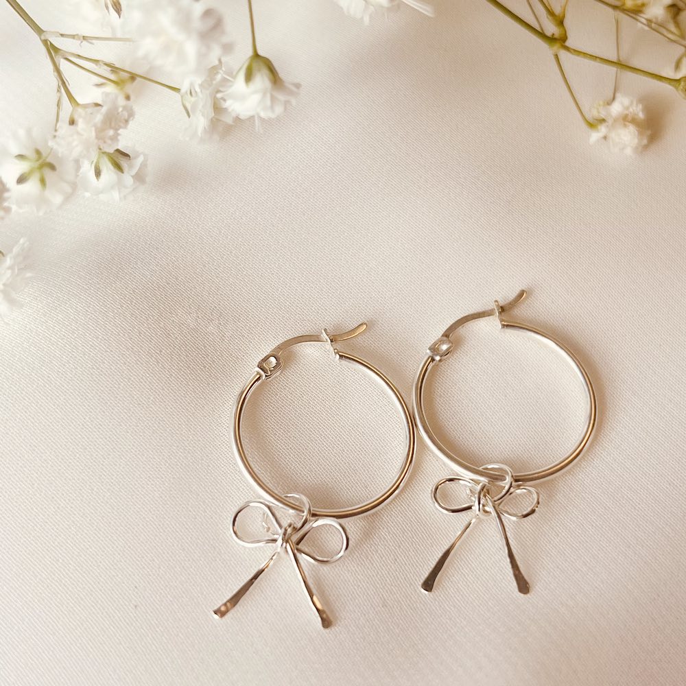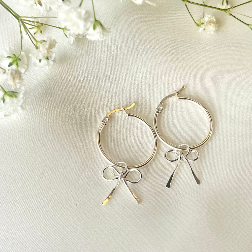 The charm features a small, handcrafted hanging bow that brings movement and charm to every step. Designed with versatility in mind, the bow is detachable, allowing you to wear the hoop alone for a minimalist look or with the bow for a sweet, statement detail.