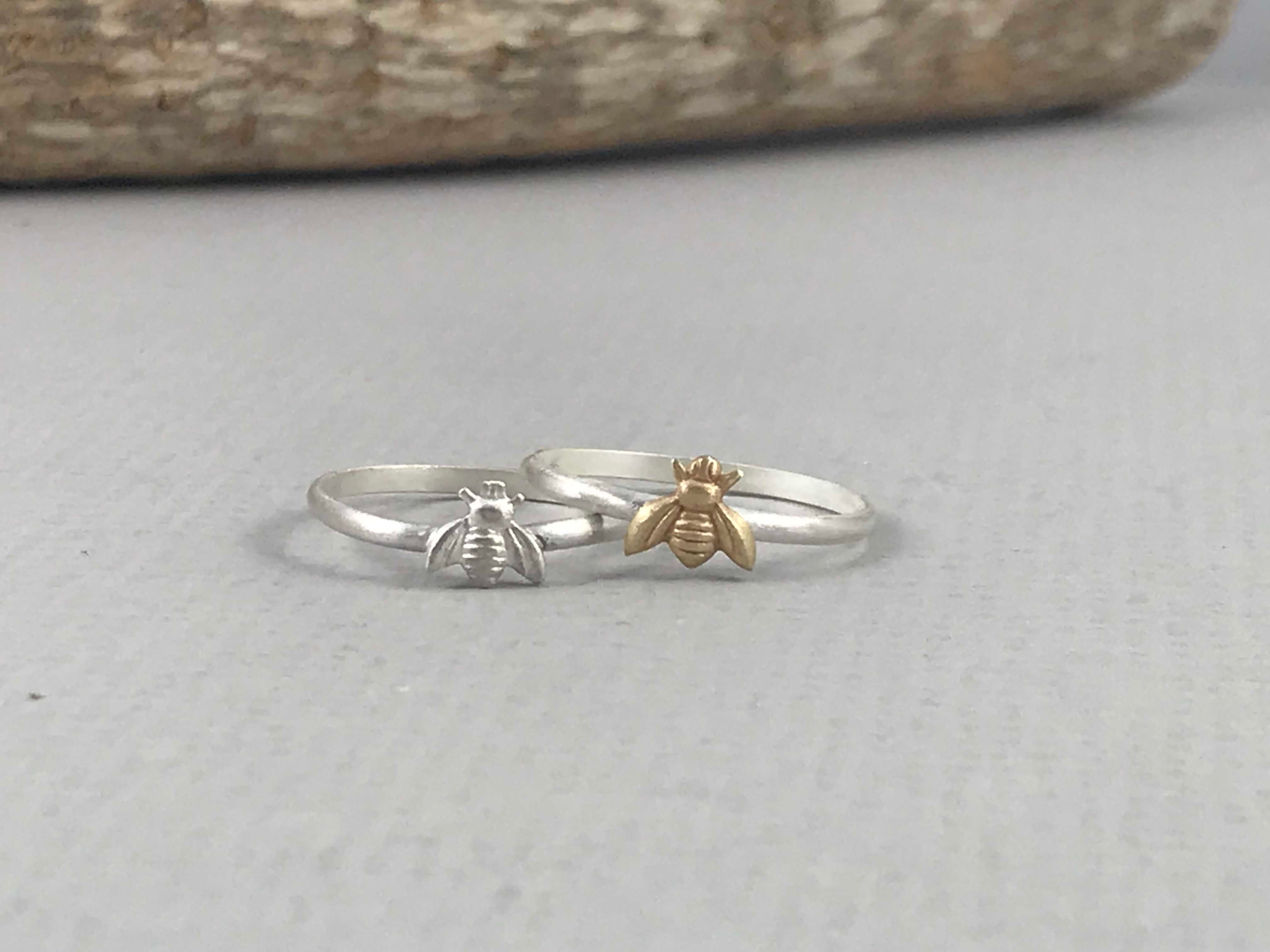 Tiny bumble bee stacking ring. A tiny cute silver or brass bee has been soldered to a simple sterling silver band. It has been tumbled for hours for a shinny finish. Comes ready to gift!