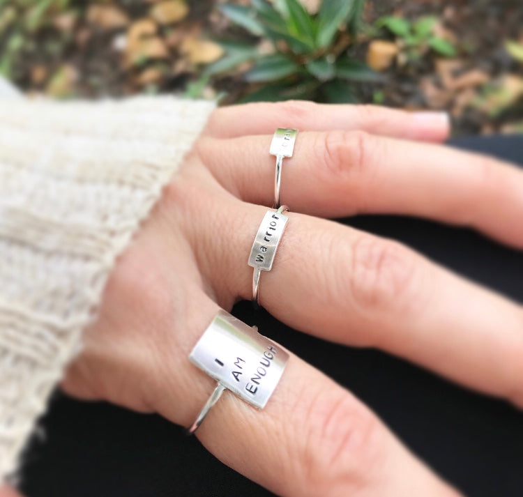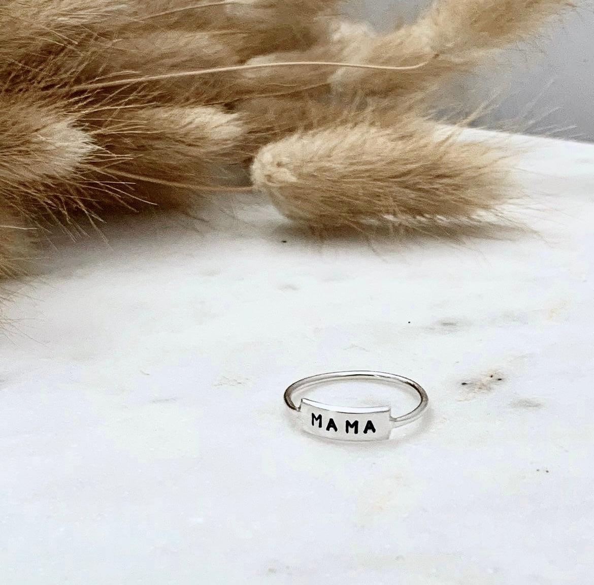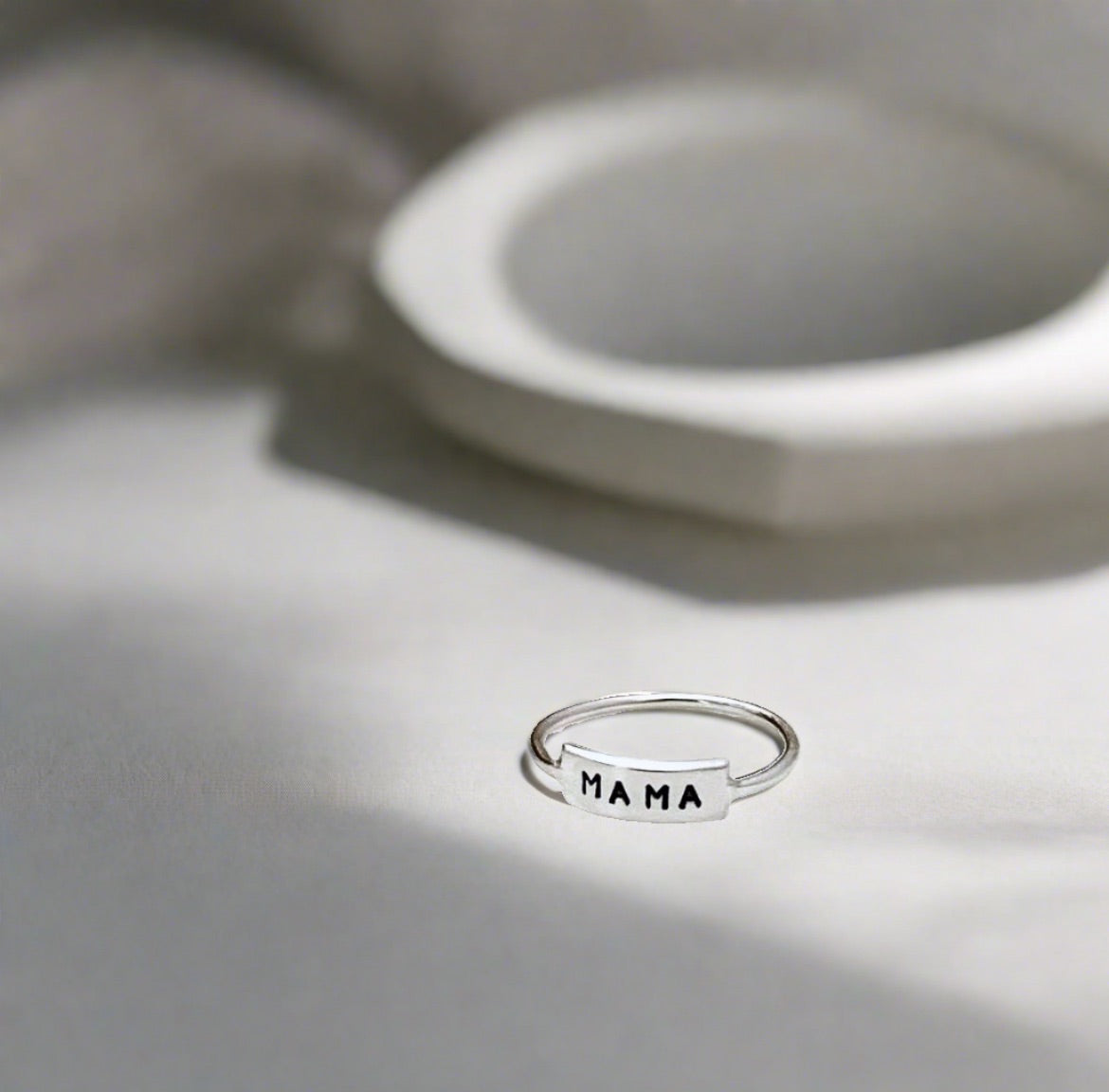 Delicate sterling silver hand stamped mama ring. This ring is made to order and you are able to customize it with your own words. Please type the word you want to be stamped on your bar ring in the "Note to the seller" or personalization box at checkout.