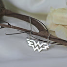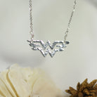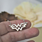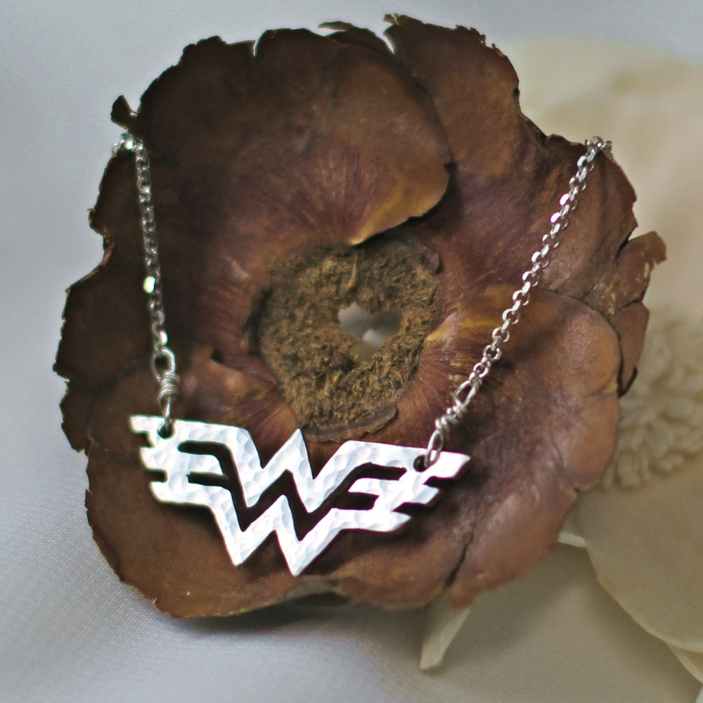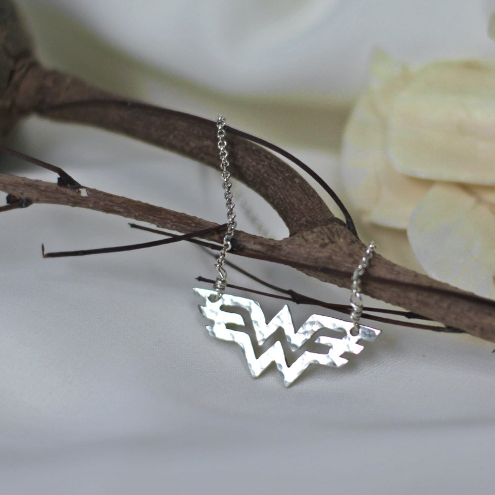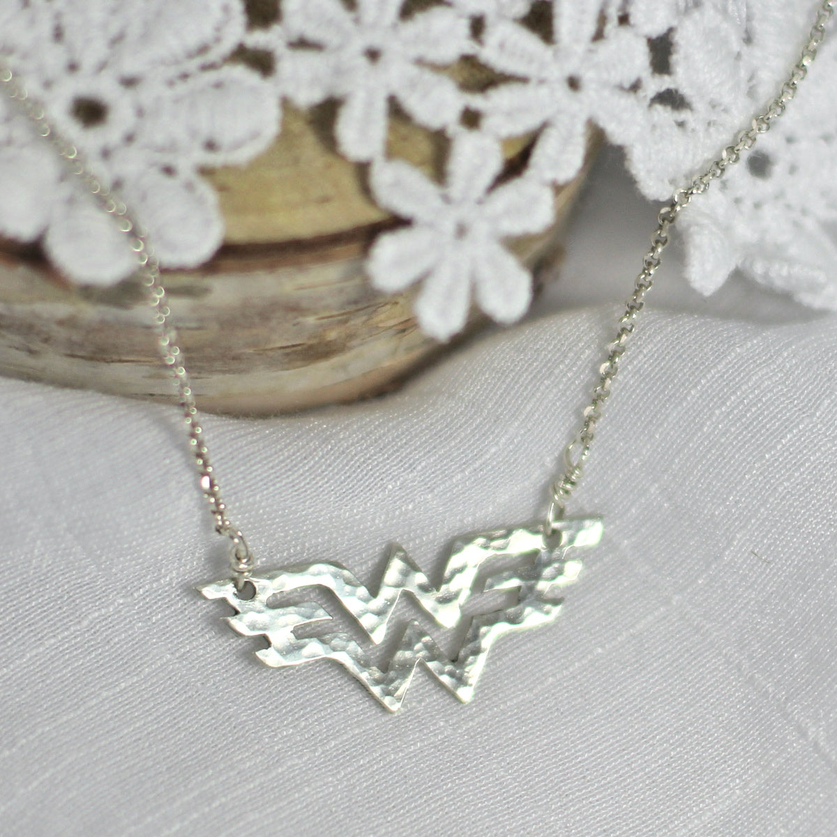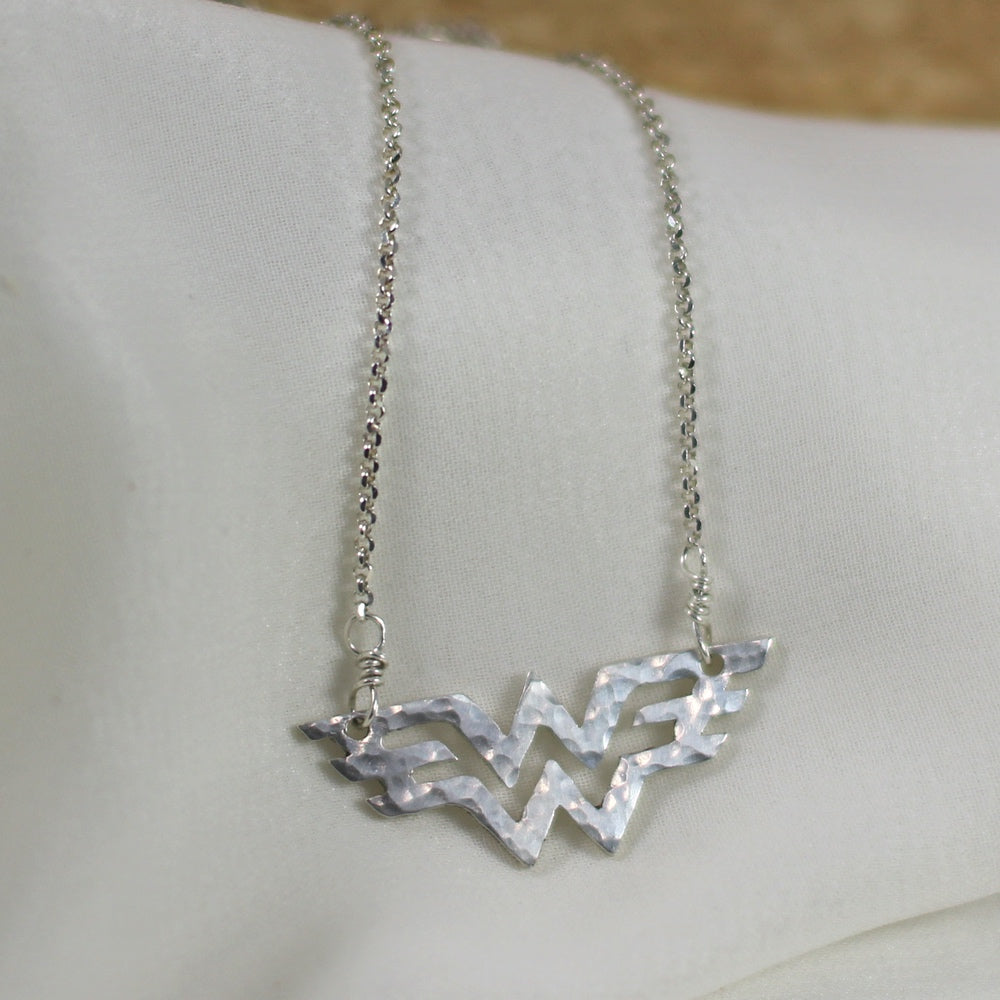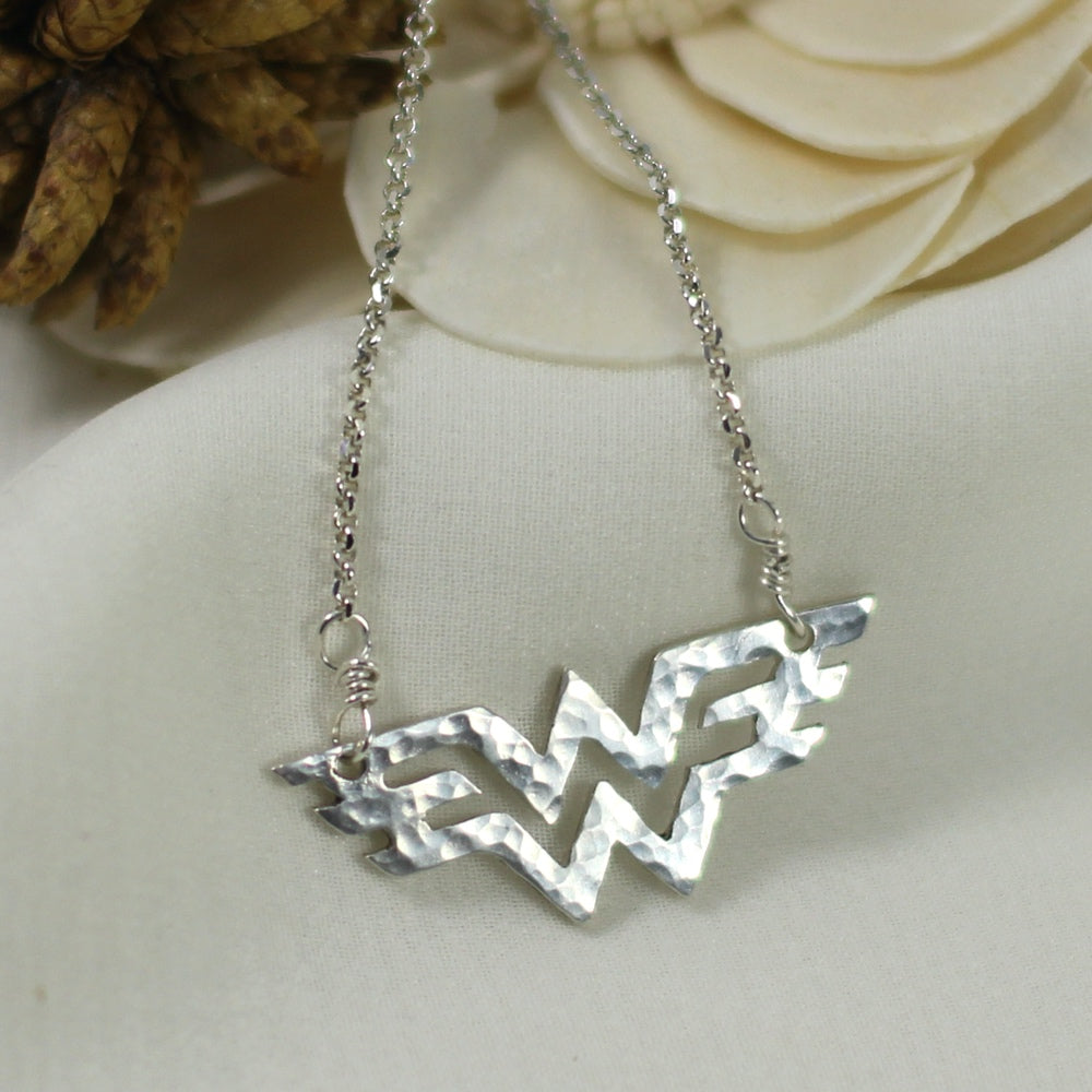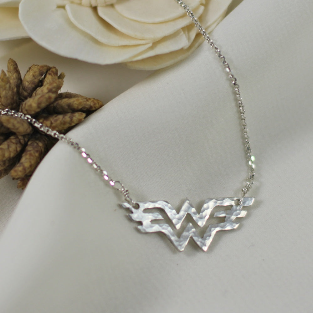 Obsessed with this hand sawed, hammered and polished sterling silver wonder woman pendant hanging in a sterling silver rolo chain with an additional 2” extension.