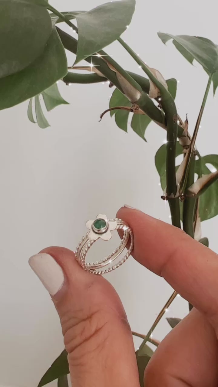 Introducing this spring our handcrafted sterling silver flower stacking rings set. Each piece in this set of three rings has been meticulously crafted. A cute little blooming flowers has been hand sawed and adorned with a precious gemstone.