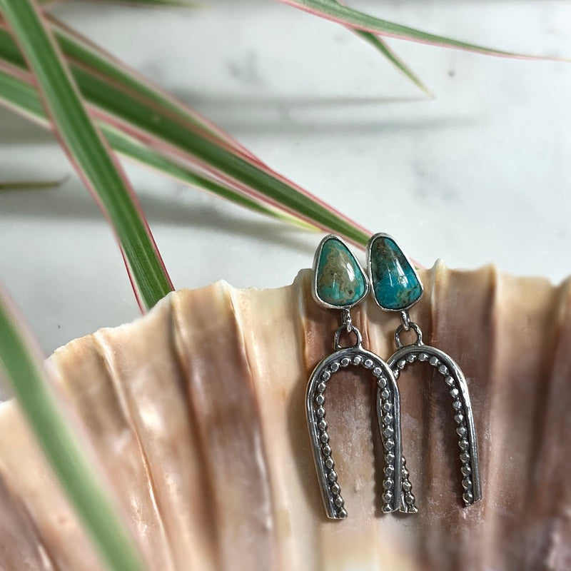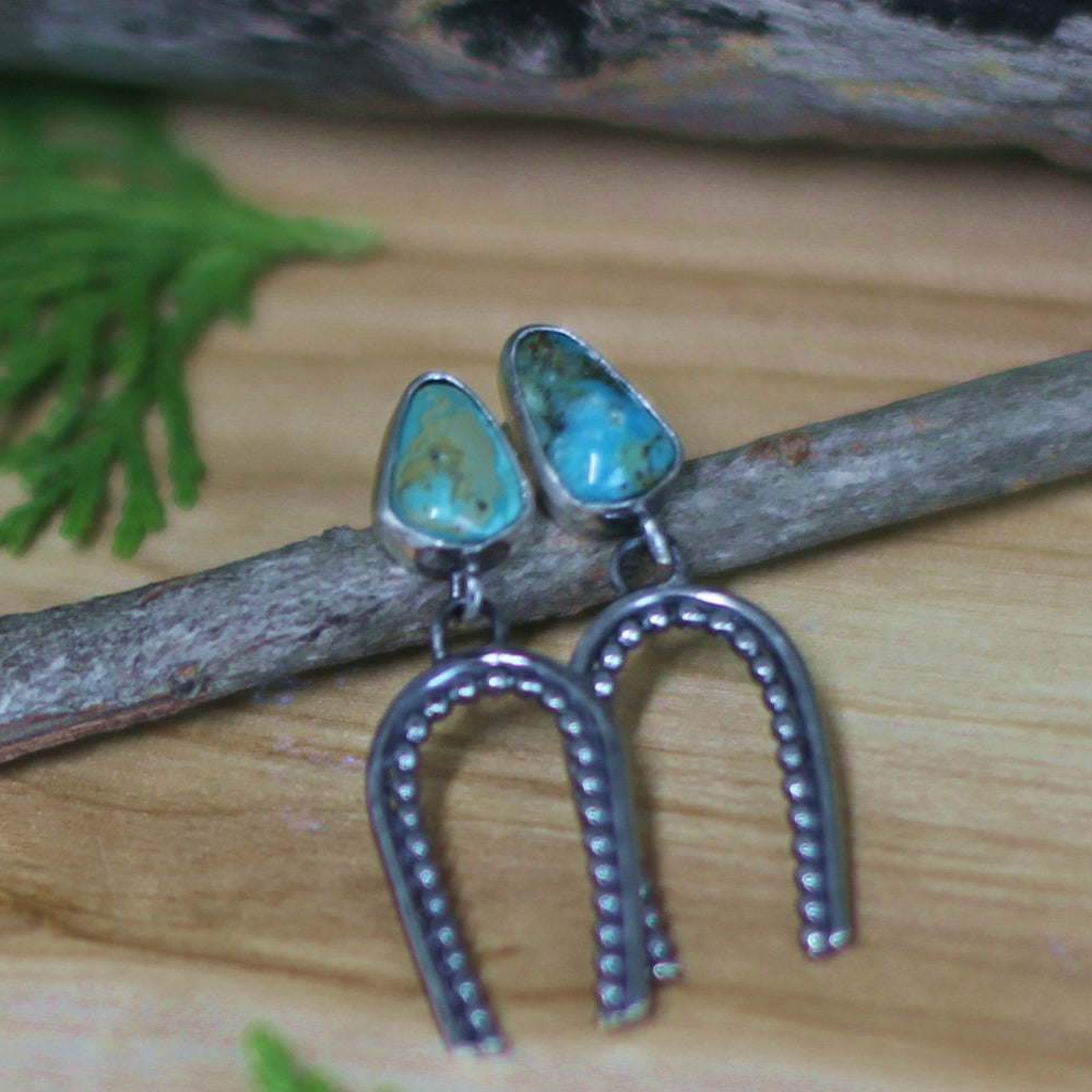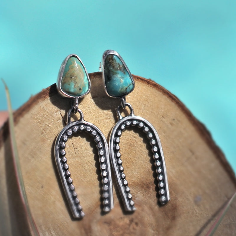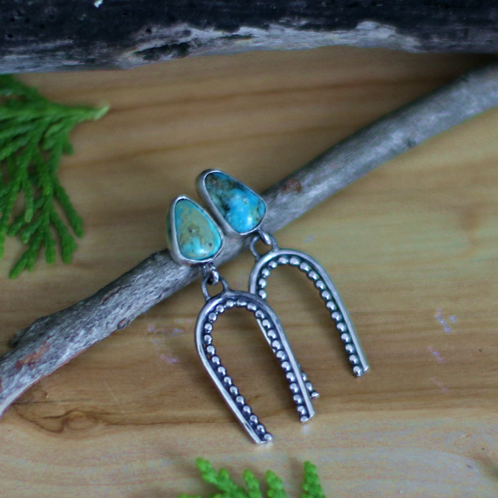 These earrings feature Royston turquoise stones. I was inspired by the last day of our stay at the beach. Florida west coast sunsets are beautiful. They have been set in 999 pure silver bezel and 925 sterling silver, adorned with handmade rainbow arch. The earrings have been made using traditional silversmithing techniques. They measure 40mm long.