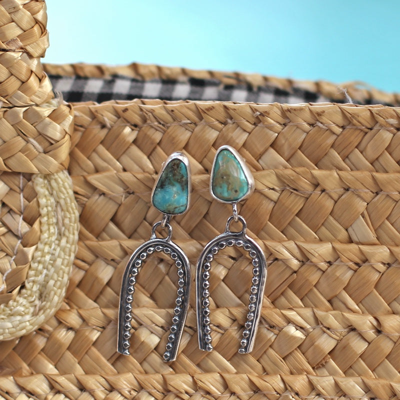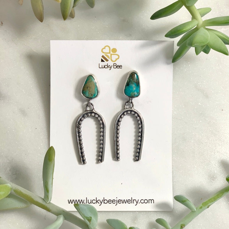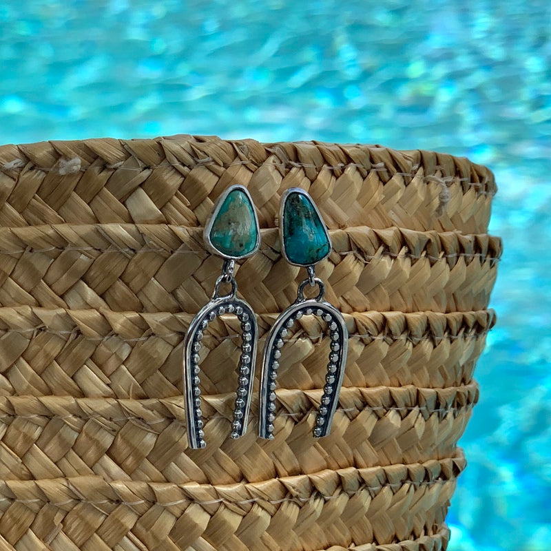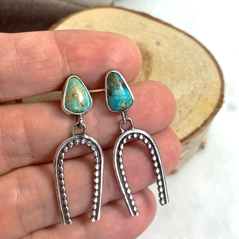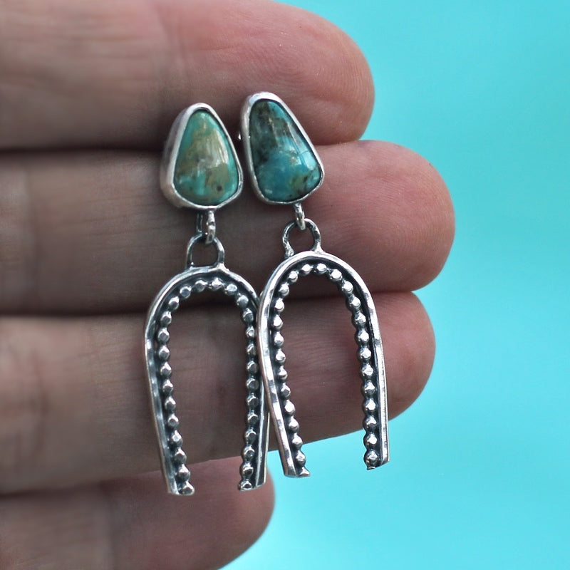 These earrings feature Royston turquoise stones. I was inspired by the last day of our stay at the beach. Florida west coast sunsets are beautiful. They have been set in 999 pure silver bezel and 925 sterling silver, adorned with handmade rainbow arch. The earrings have been made using traditional silversmithing techniques. They measure 40mm long.